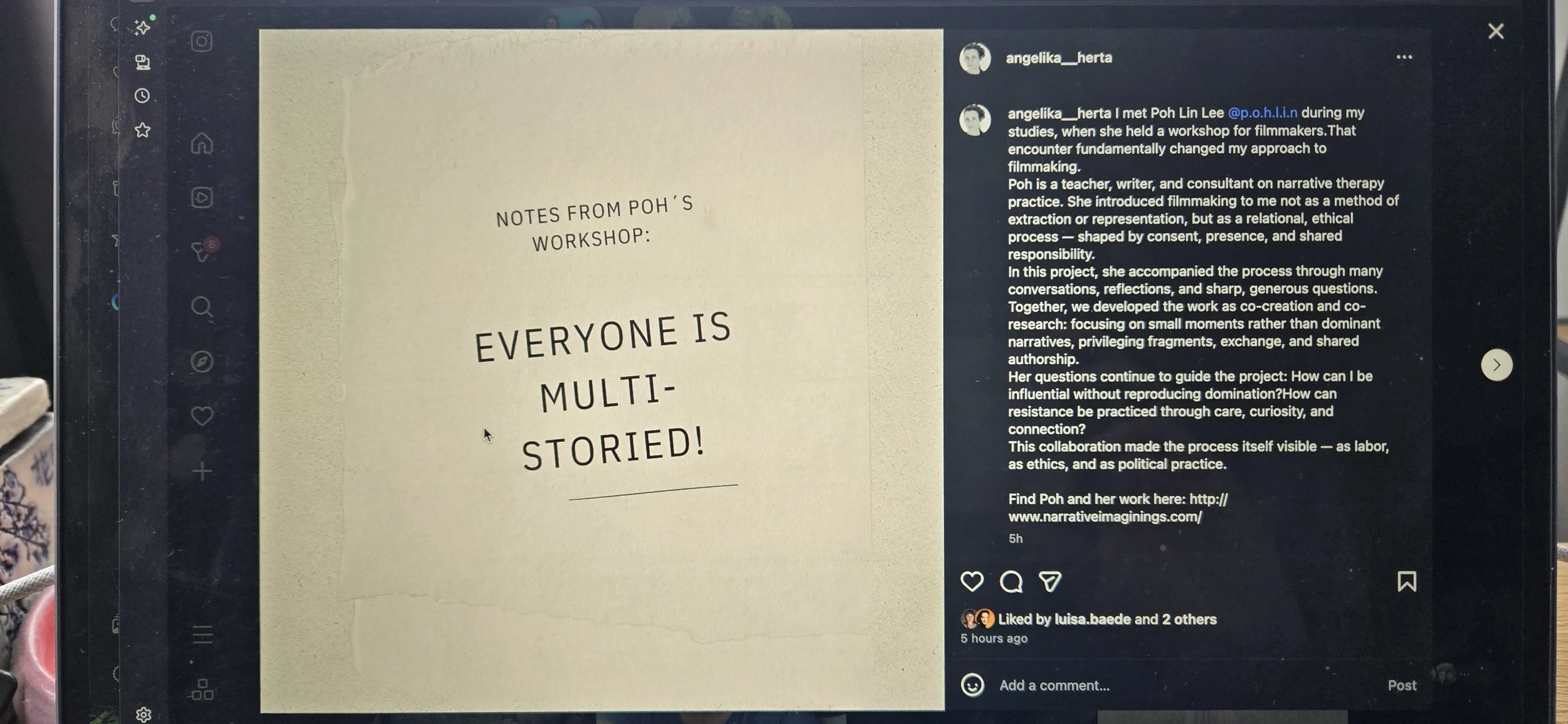 In this project, she accompanied the process through many conversations, reflections and sharp, generous questions. Together, we developed the work as co-creation and co-research: focusing on small moments rather than dominant narratives, privileging fragments, exchange, and shared authorship.